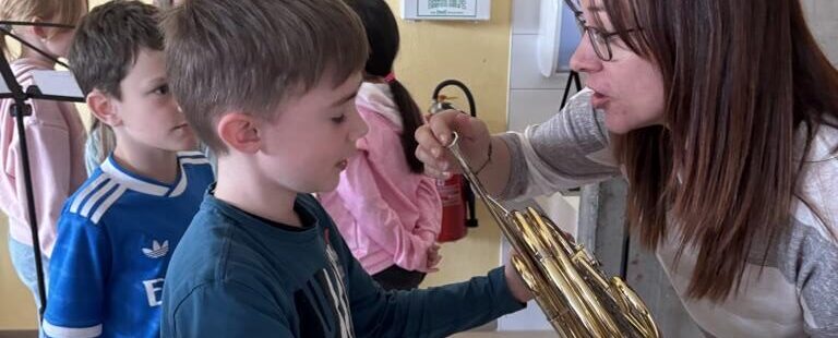 Am Donnerstag nach Ostern besuchte uns eine Abordnung der Blasmusikkapelle und stellte uns ihre Instrumente vor. Nach einer kurzen Klanggeschichte mit Hörproben durften wir selbst einige Instrumente ausprobieren.
